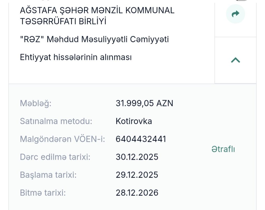 Ötən il olduğu kimi yenə Ağstafa Rayon İcra Hakimiyyəti Tender oyunlarına qədəm qoyubdur. Sözü gedən rayonda 2025 ci il ərzində ayrılan Tenderlərin tamamlanma işləri öz həllini tapmayıbdır. Abadlaşdırma, yaşıllaşdırma, təmir-tikinti işləri, maşın ehtiyatlarının alınması, müxtəkif istehlak malların, yol təmiri, yolların asfaltlanması adı altında ayrılan Tenderlərin maliyyəsi sual altında qalıbdır.