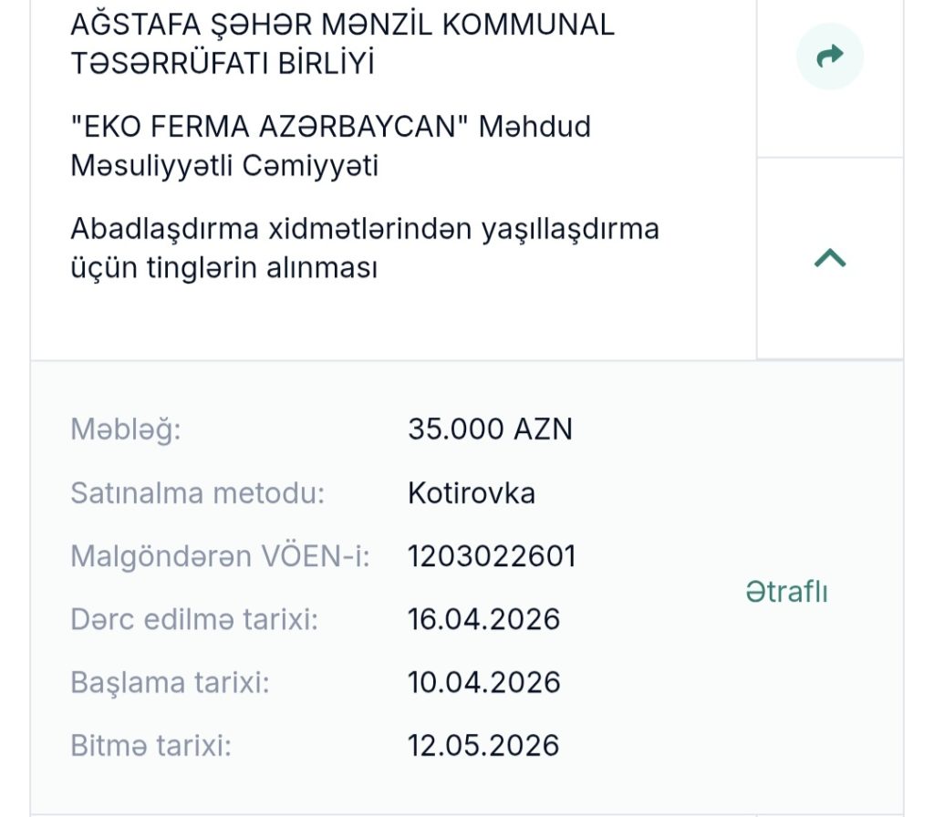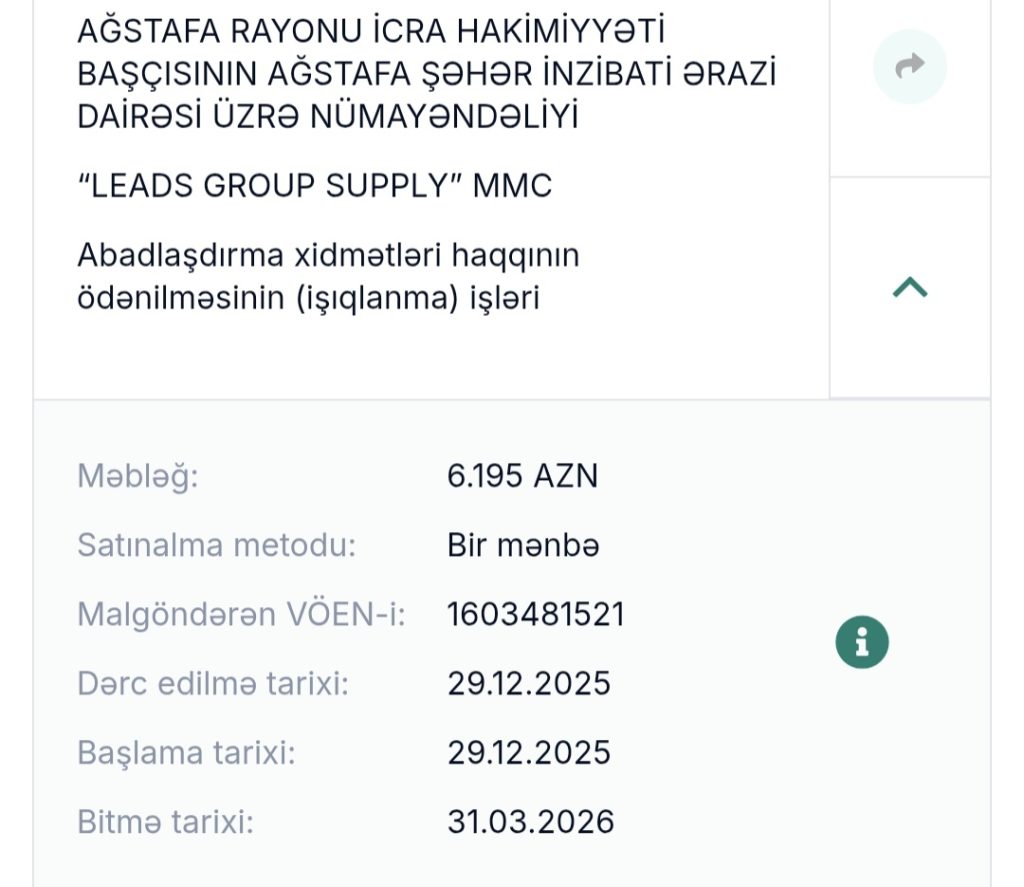 Ağstafa rayon İcra Hakimiyyəti 2026 cı ildə görülən işlərin Tenderini elan edibdir. Maliyyə əldə olunubdur, hansı işlərin yekunlaşıb öz təsdiqini tapması yenə sual altındadır. Rayonda eyni ad altında hər il Tender elan olunur, maliyyənin xərclənməsinin hesabatı soruculmur. Axı niyə?