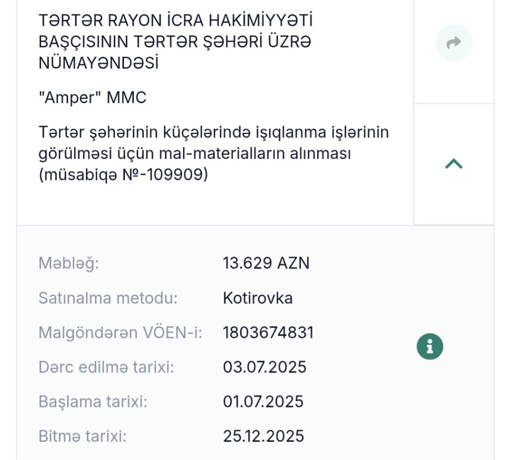Tərtər rayon İcra Hakimiyyəti 2025 ci il ərzində müxtəlif tenderlərun maliyyəsini əldə edərək rayonda, təmir tikinti işlərinə, yolların abadlaşmasına, yaşıllaşdırma işlərinə, kənd küçələrinin işıqlandırmasına və s. İşlərə 2 milyon manata yaxın maliyyə xərcləyibdir. Rayonda o işlərin görülməsi qisməndi, halbuki 2025 ci il ərzində bu işlər tamamlanmalı idi, lakin nədənsə işlərin tamamlanması gecikir.
