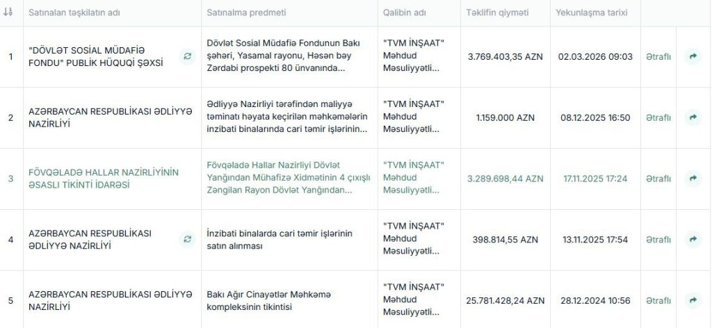 2024-cü ildə Ədliyyə Nazirliyi ilə bağlanan satınalma müqaviləsinin də dəyəri böyükdür. Şirkət Bakı Ağır Cinayətlər Məhkəmə kompleksinin tikintisi üçün 25,8 milyon manat alıb.