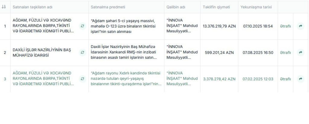 Bu tenderlər arasında ən bahalısı Füzuli rayonu, Dövlətyarlı kəndi üzrə fərdi yaşayış evlərinin, qeyri-yaşayış binalarının, sahədaxili mühəndis kommunikasiyaları sistemlərinin (su, kanalizasiya, qaz xətləri, elektrik və rabitə şəbəkəsi), daxili yol və səkilərin tikinti-quraşdırma işlərinin satın alınması olub. Bu satınalma 2024-cü ildə bağlanıb və dəyəri 97 milyon 212 min manat təşkil edib.